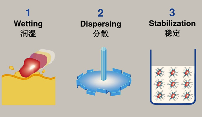 1、潤濕:樹脂或添加劑取代顏料表面的吸附物,如空氣、水份,使顏料表面由固/氣相轉(zhuǎn)化為固/液相。