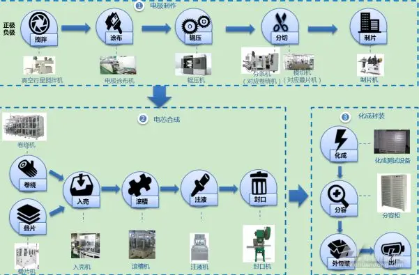 在新能源快速發(fā)展的市場環(huán)境下,鋰離子電池的應(yīng)用可說是目前新能源發(fā)展較為明顯的產(chǎn)業(yè),鋰離子電池是一個復(fù)雜的體系,包含了正極、負(fù)極、隔膜、電解液、集流體和粘結(jié)劑、導(dǎo)電劑等,涉及的反應(yīng)包括正負(fù)極的電化學(xué)反應(yīng)、鋰離子傳導(dǎo)和電子傳導(dǎo),以及熱量的擴(kuò)散等。鋰電池的生產(chǎn)工藝流程較長,生產(chǎn)過程中涉及有50多道工序。其生產(chǎn)工藝有一定差異,但整體上可將鋰電制造流程劃分為前段工序(極片制造)、中段工序(電芯合成)、后段工序(化成封裝)。