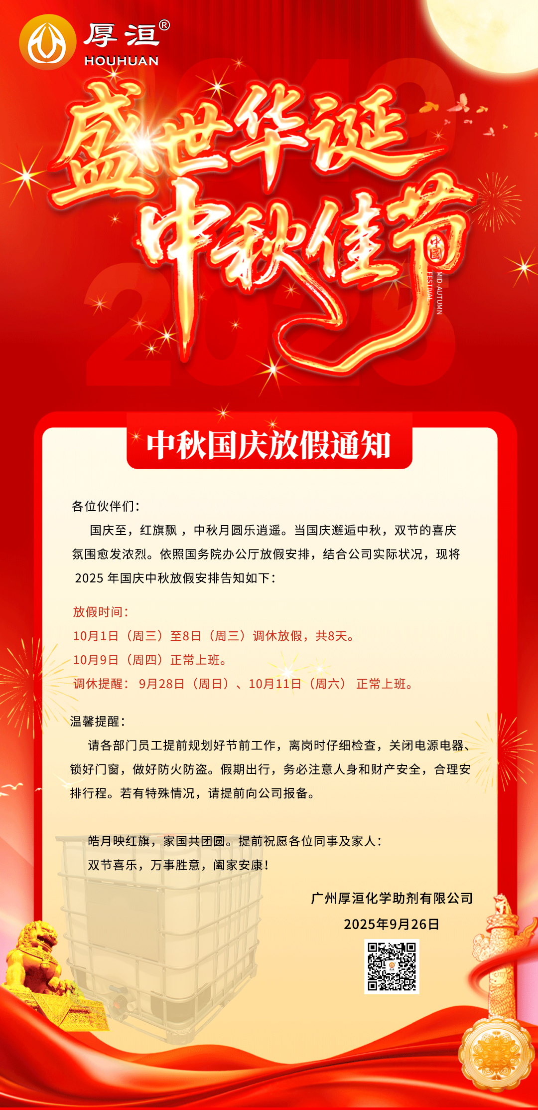 國(guó)慶至,紅旗飄 ,中秋月圓樂(lè)逍遙。當(dāng)國(guó)慶邂逅中秋,雙節(jié)的喜慶氛圍愈發(fā)濃烈。依照國(guó)務(wù)院辦公廳放假安排,結(jié)合公司實(shí)際狀況,現(xiàn)將 2025 年國(guó)慶中秋放假安排告知如下: